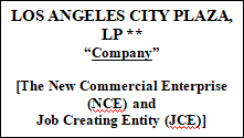 The Company, New Commercial Enterprise and Job Creating Entity (or ¡°NCE¡± or ¡°Offeror¡±) | Los Angeles City Plaza, LP is a California limited partnership with its principal place of business located at 1598 Long Beach Blvd., Unit 101, Long Beach, CA 90813. The Company was formed on November 20, 2013, and is a ¡°new commercial enterprise¡± and ¡°job creating entity¡± within the meaning of the EB-5 Program. The term of the Company commenced upon the filing by the General Partner of the Certificate of Limited Partnership with the Secretary of State of the State of California and shall continue until the Company is dissolved, wound up and terminated in accordance with the provisions of the Company¡¯s Partnership Agreement and the California Act. |