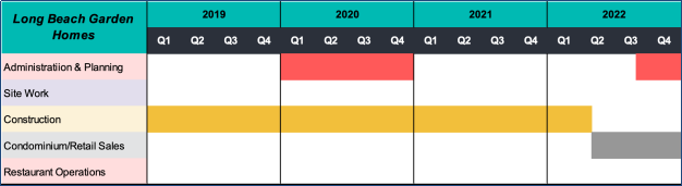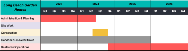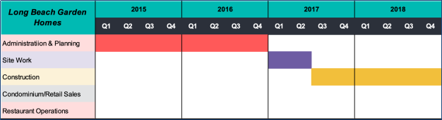 The Company was formed on June 18, 2012 for the purposes of developing and operating the Long Beach Homes Project which consists of a 4-story, approximately 90,200 square foot mixed-use development consisting of 4,800 square feet of retail space for lease, two restaurants totaling 5,256 square feet, at 36 residential condominium units for sale at 1598 Long Beach Boulevard, Long Beach, California 90813 (collectively referred to as the ¡°Project¡±) all as described in further detail in this Memorandum, below. Final square foot and building setup may vary subject to market change and/or requirement by government.